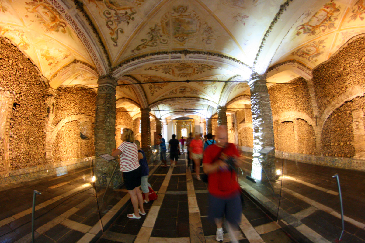 Évora es una petita ciutat medieval a pocs quilòmetres de Lisboa. Entre d’altres meravelles històriques, destaca la capella dels ossos. No és una metàfora, està construïda a partir dels ossos humans de diversos cementiris el segle XVII. Hi ha comptabilitzats uns 5000 cranis, un espai realment angoixant, dedicat a la meditació dels monjos que la van construir. A la primera imatge també s’ha fet servir la tècnica de HDR i ull de peix.