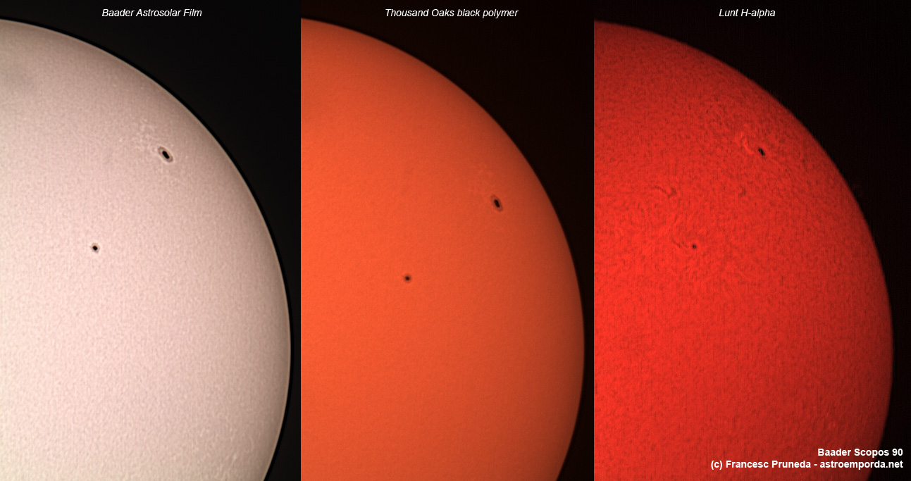 De filtres pel sol hi ha de diversos tipus, els més habituals són els de la barca alemanya Baader Planetarium. Es tracta d’una làmina similar al paper d’alumini que dóna una aparença blavosa al sol. Les “ulleres d’eclipsis” també es fan amb aquesta làmina. Una làmina Baader de mida DIN A4 val uns 30€. Altres marques com Thousand Oaks fan làmines amb un objectiu similar, com les de polímer negre, que ofereixen el sol a color real, apareixent d’un taronja intens. Aquests filtres ens permeten veure la fotosfera, és a dir, la superfície del sol i les taques.