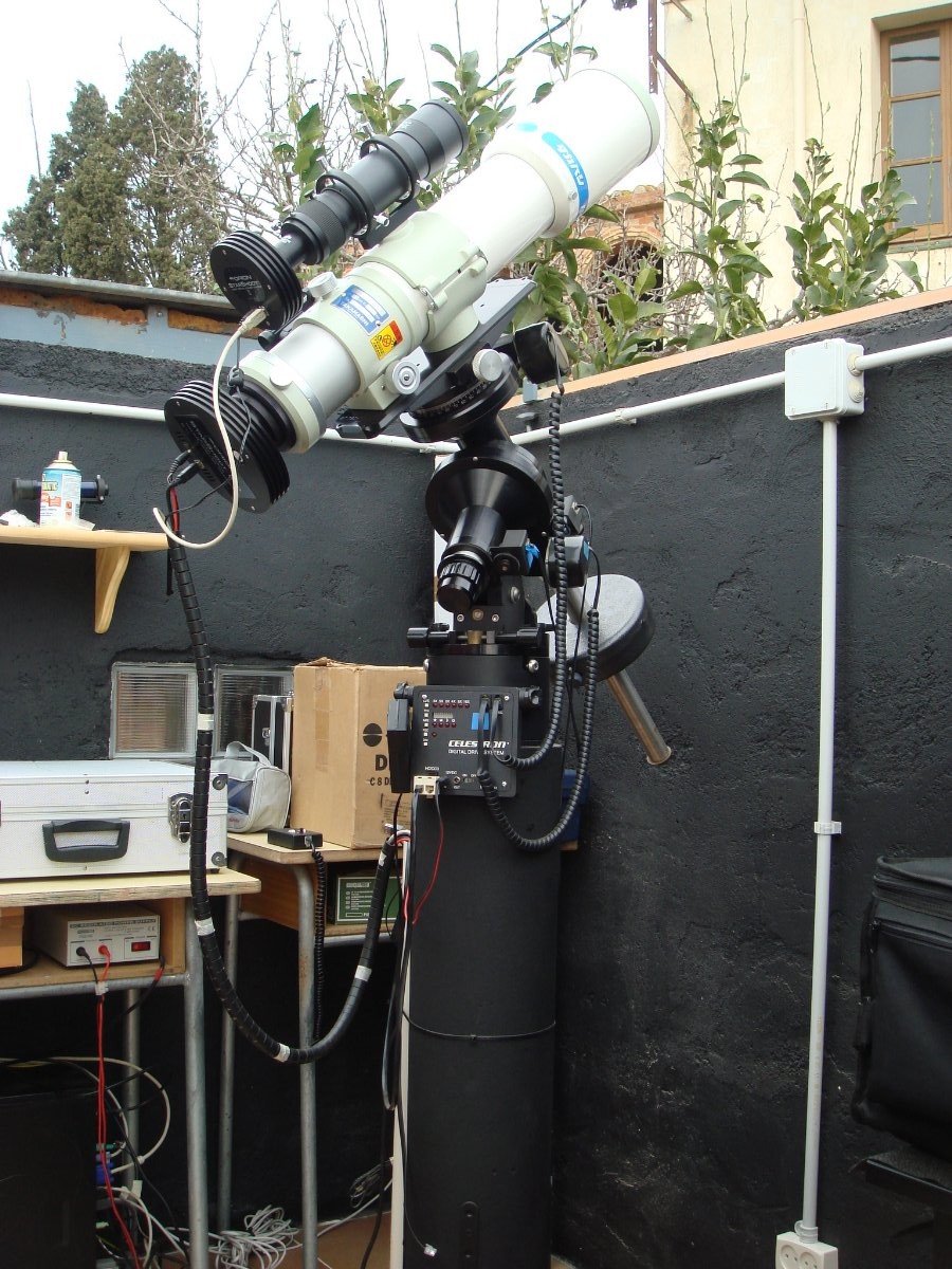 | Equip principal d’astrofotografia: Telescopi Takahashi FSQ. Refractor apocromàtic, quatriplet de fluorita. 106mm Ø f/5.Telescopi Lunatico EZG-60. Refractor acromàtic. 60mm Ø f/3.8. Usat per autoguiat.Muntura Losmandy G11 amb encoders Bbox. |