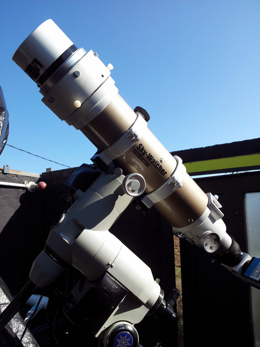 Telescopi Sky watcher 80ED. Doblet apocromàtic de 80mm de diàmetre i 600 mm de focal f/7.5. A la imatge amb la muntura LCD75 i filtre H-alpha Lunt