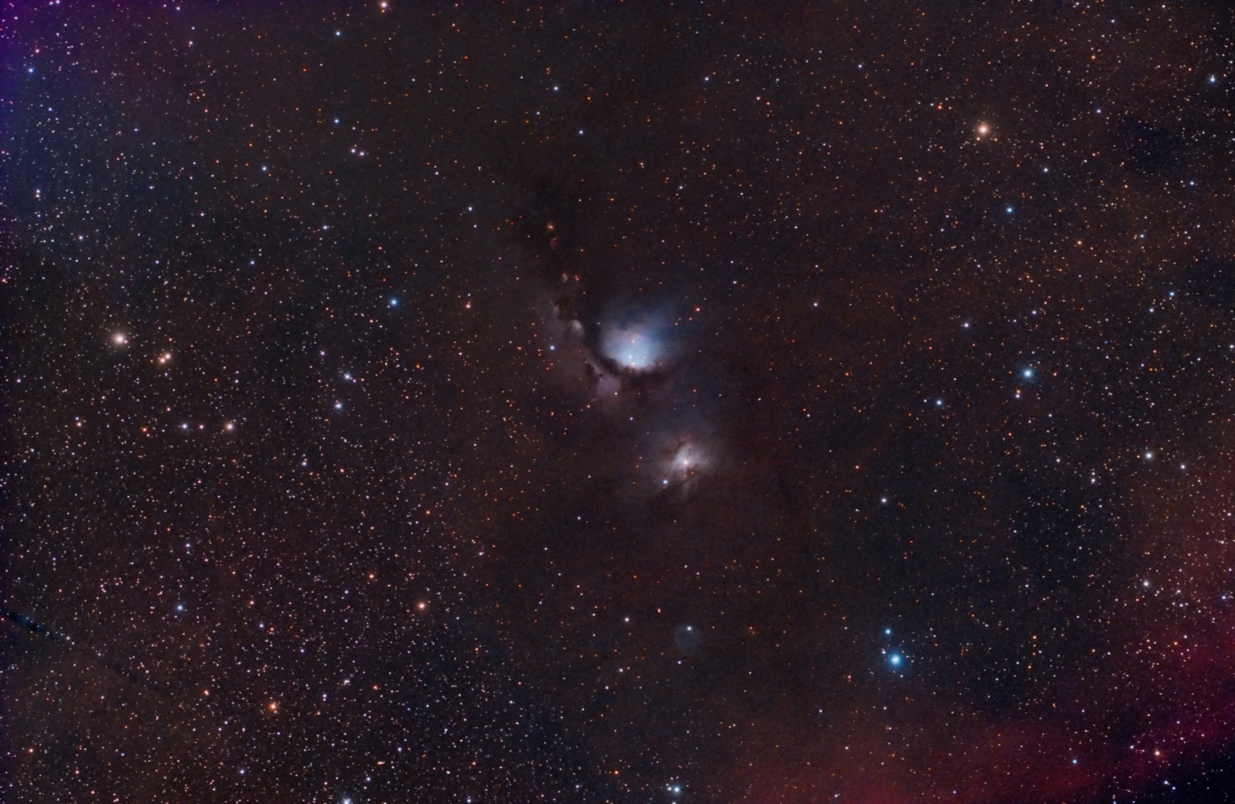 Orió és una constel·lació plena de nebuloses interessants i conegudes com la gran nebulosa M42 i el cap de Cavall B33 i alguna de poc coneguda com el bucle de Barnard i la nebulosa M78. Aquesta nebulosa està una mica al nord de del Cap de cavall, però a diferència de les més conegudes, no és vermella, sinó blava, i això és degut a que no brilla per estar calenta, és a dir, no és el gas que brilla, sinó que reflexa la llum de les estrelles que la conté. I després d’acumular gairebé 4 hores d’exposició es veuen fins i tot els núvols de pols que ens en tapen un troç. La nebulositat vermellosa de la part inferior és una part del gran bucle de Barnard.