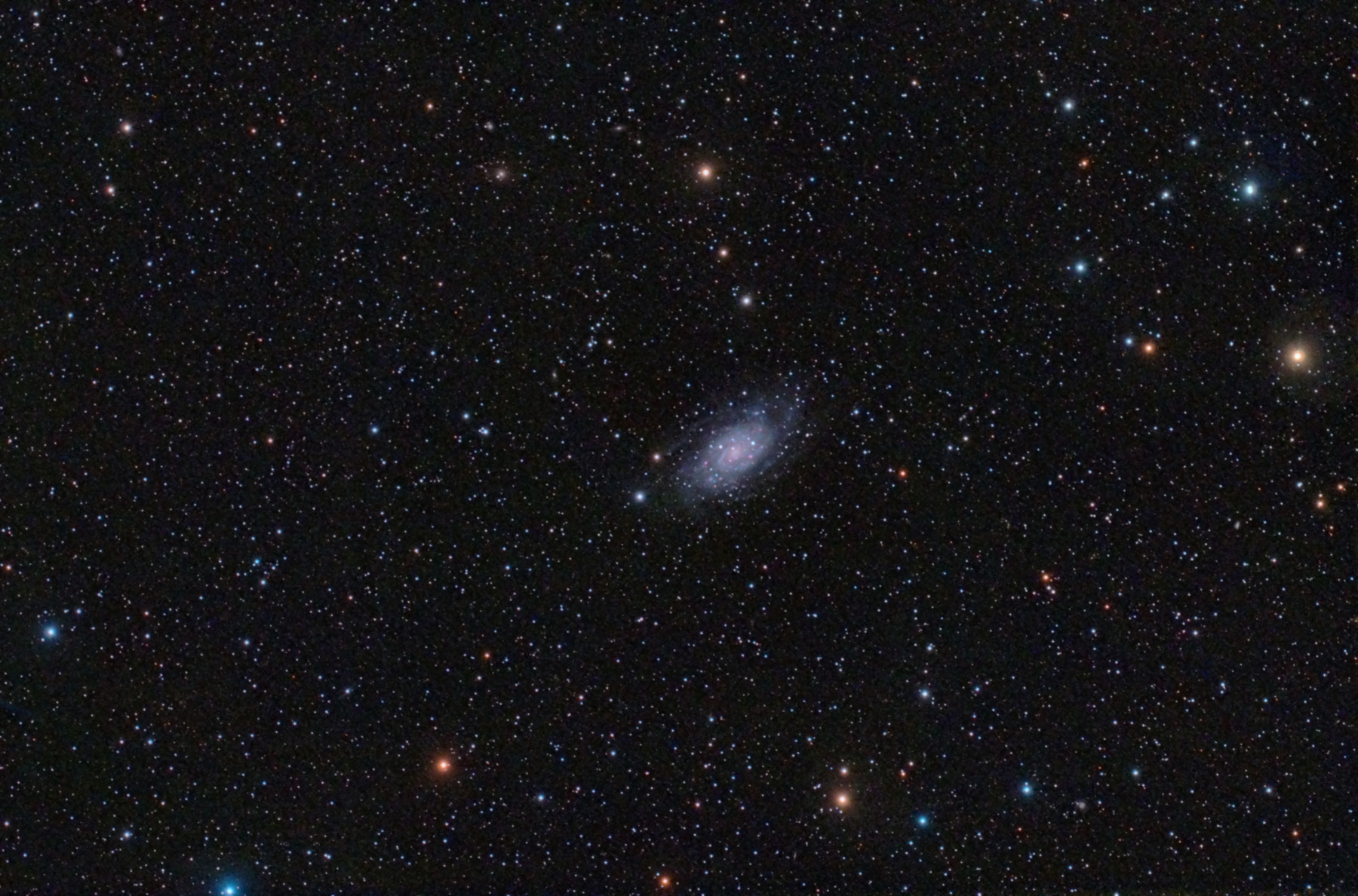La primera de les captures és la galàxia NGC 2403 a la constel·lació de Camelopardalis. És relativament brillant (magnitud 8.2) i és sempre visible ja que des de la nostra latitud no es pon mai (es diu que és circumpolar). En aquest cas vaig acumular 30 imatges de 5 minuts, completant 2:30h d’exposició, i això que és brillant!