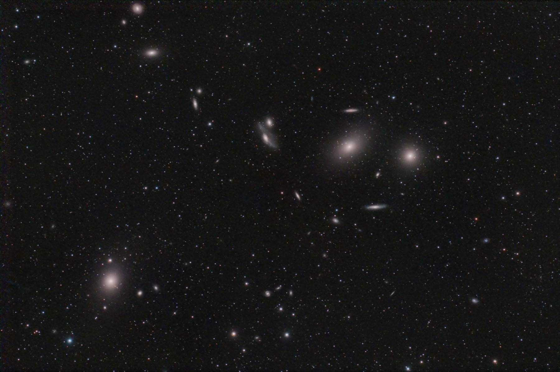 I finalment, el cúmul de galàxies de Virgo. Aquest cúmul de galàxies està centrat a les galàxies el·líptiques M86 (la més gran, magnitud 8.9) i M84 (a la dreta, mag. 9.2). La galàxia allargada de la seva esquerra és NGC 4438 (mag. 10) i a la part inferior esquerra M87 (mag 10.8), acompanyades d’una gairebé infinitat d’altres galàxies, i se’n podrien arribar a comptar fins a 30!! Van caldre 245 minuts, 4 hores per a poder caprurar-les totes, però va valdre la pena!