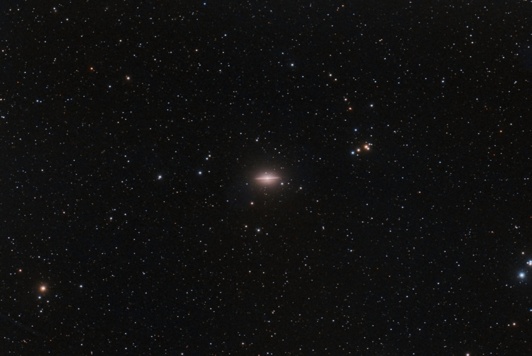 Una de les galàxies més curioses en quant a forma és la galàxia del barret M104 (o galàxia sombrero). Es troba a la constel·lació de Verge, just al costat del Corb amb una magnitud de 8.3. No només es manté sempre molt baixa a l’horitzó, sinó que a més és més aviat petita, 8,6′ (minuts d’arc, unes 4 vegades més petita que la lluna). De totes maneres amb 165 minuts d’exposició ja podem apreciar la seva forma característica.
