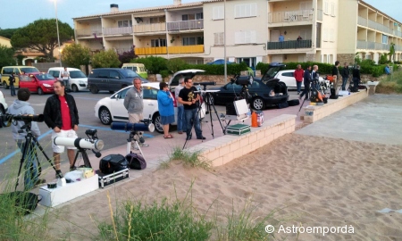 Al voltants de les 5:30 del matí al punt d’observació situat a un dels aparcaments de la platja de Pals ja hi havia un bon nombre d’observadors i curiosos amb el material a punt, i alguns que anaven arribant de mica (s’ha de dir que el despertador m’ha jugat una mala passada i gairebé no arribo…), fins el punt de ser una trentena de persones de diverses ubicacions, com Palafrugell, Palamós, Girona, Sabadell, Barcelona o inclús Viscaia!, amb diversos telescopis, prismàtics, ulleres solars i càmeres, moltes càmeres de tot tipus a punt per a captar l’últim trànsit de venus en 100 anys. D’entre el grup d’Astronomia des de l’Empordà, un telescopi C8 amb filtre Baader i un refractor 80 ED amb filtre H-alpha Lunt, acompanyat de 5 càmeres amb diversos teleobjectius, un Solarscope i diverses ulleres solars, agraïnt als companys Marc Heras i Kilian Rico la seva col·laboració.