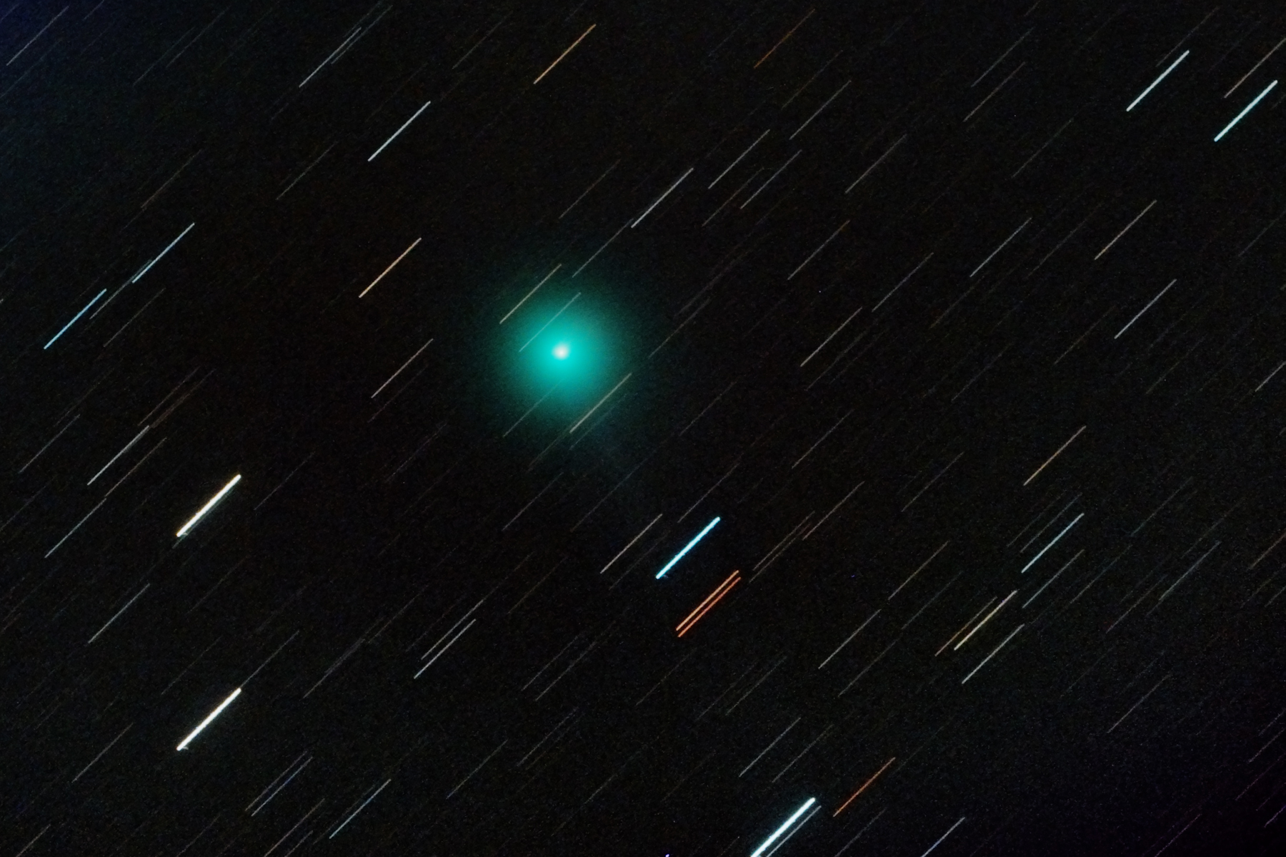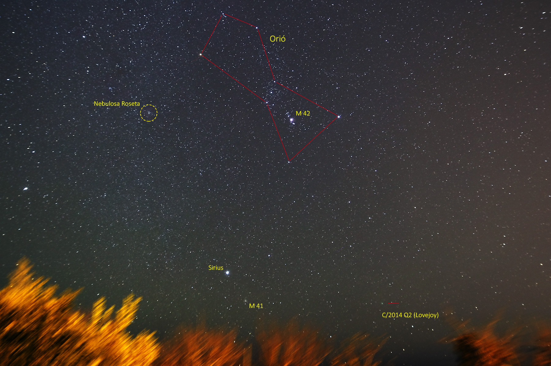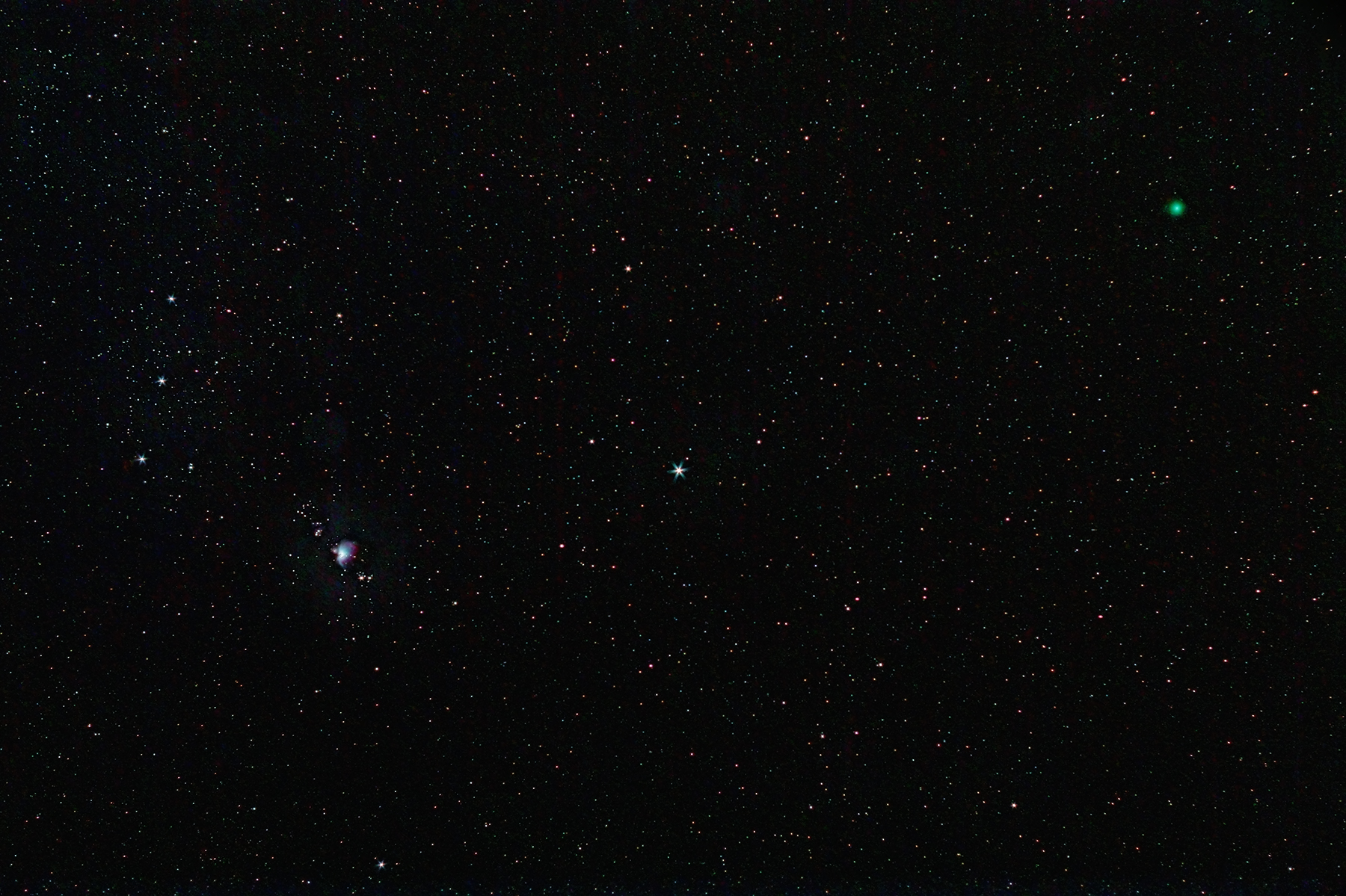Finalment ahir al vespre, dia 4 de gener, des del Far de Sant Sebastià, vaig intentar fer un entremig, ni tant gran camp, ni telescopi, i vaig treure del record un antic objectiu Zeiss de 50mm f/1.8 (que vaig haver de tancar fins a f/5, realitzant 30 fotografies de 30 segons (15 minuts d’exposició total), podreu veure a l’esquerre la part baixa de Orió, amb la nebulosa M42, i a la dreta el cometa, que ja ha guanyat molta alçada, i n’ha de guanyar més!